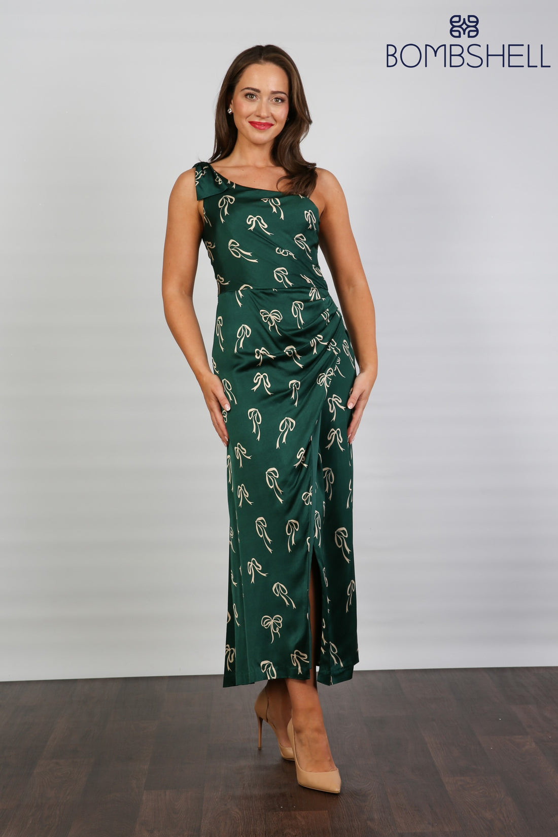 Bombshell Louise One Shoulder Party Dress in Dark Green Bows- Regular price