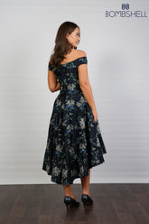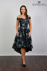 Bombshell Blair Bardot Embroidered High-Low Dress in Navy Honeysuckle
