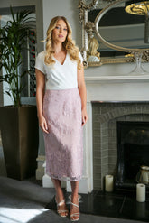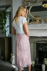 Featuring soft scuba jersey with figure flattering pleats and a lovely contemporary embroidery over the contrast navy skirt, you will be both stylish and comfortable in the Brooke dress. Cut to a midi length approx. 30" waist to hem.