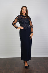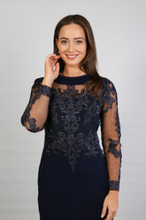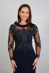 Picture perfect evening dress ideal for all your formal evening occasions. Designed with a lightly textured matte fabric which is crease resistant and has just a little stretch. Long tulle sleeves and flattering embroidery design.