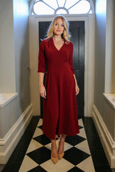 This graceful dress features a full skirt, just past the elbow sleeves, and thoughtfully placed pleating all in soft moss crepe for a comfortable smooth fit.
