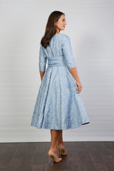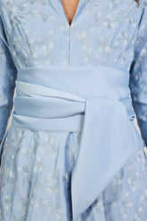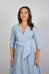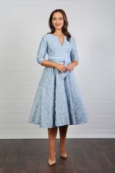 Gorgeous textured satin shimmers softly through this fitted dress. The self tie sash can be wrapped once or twice around the body according to your own individual style. A flattering neckline and past the elbow sleeves create a perfect Mother of the Bride or Mother of the Groom dress.