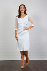 Sophisticated pleating gives a cinched effect waist on this wrap effect dress. Designed in luxe satin with semi-sheer chiffon sleeves, just lovely for your special events. Waist to hem measures approx 28".