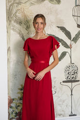 Your perfect evening dress with flutter sleeves, full and flowing to dance the night away. Designed in soft crepe fabric with a delicate satin waistband.