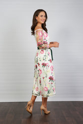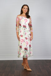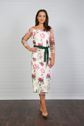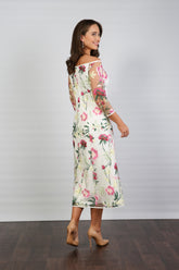 Perfect for your summer events, featuring the most special colourful embroidery of summer flowers. Smooth jersey creates a figure flattering silhouette which can be worn with or without the satin belt. Long sheer sleeves add cool elegant overage.