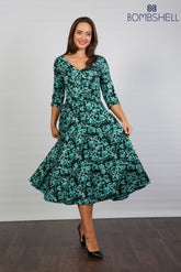 Our Edge of the Shoulder Dress in Marina Roses is the perfect vintage-inspired dress, with a flared 50s style skirt to balance out your shape.