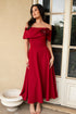 A beautifully styled off-the-shoulder special occasion dress. Wear with matching Ispirato hat ISF3101 in Pomegranate.