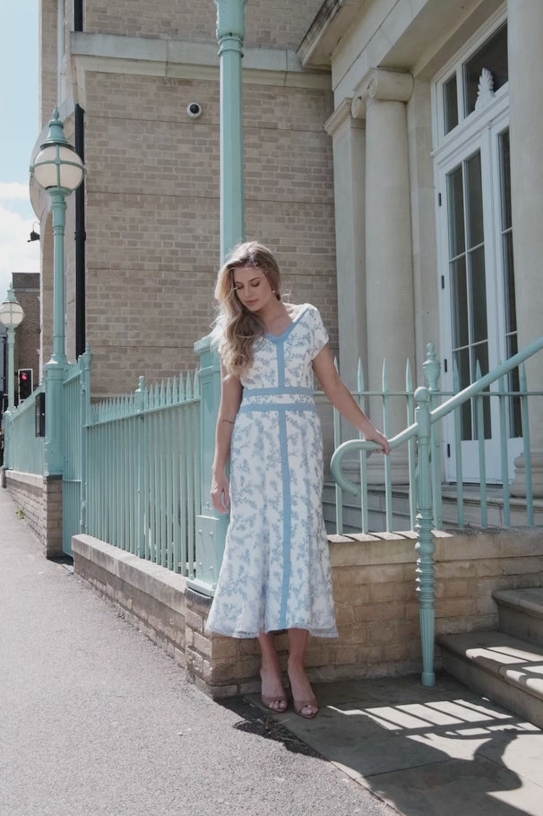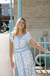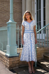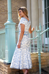 A stunning fit and flare jersey dress with gorgeous lavender inspired embroidery. Feature satin defines your waist, whilst the cap sleeves and neckline keep you cool and comfortable. Ideal for formal summer events.