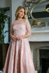 A lightweight embroidery pattern is sheer at the neck and sleeves falling over a full luxe satin skirt. Perfect for all figures and all special occasions.