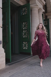 Marilyn Luxe Satin Embroidery Occasion Dress in Ruby