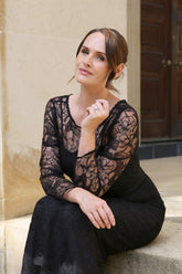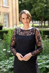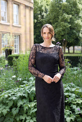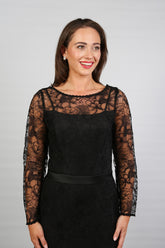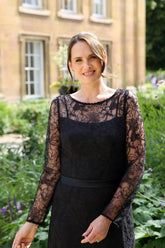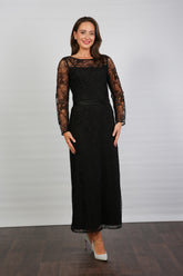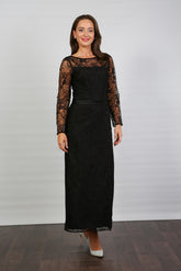 The perfect style for a sophisticated evening occasion. Soft jersey fabric is overlaid with textured lace giving an immaculate elegant fit. Neckline and long sleeves are sheer for comfort, waist to hem approx 38".