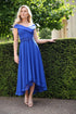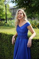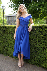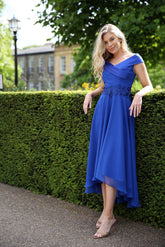 From the pleated satin Bardot neckline to the flowing chiffon high-low hem, everything about the sophisticated Melina dress imbues opulence and romance. Perfect for all your outdoor summer events, or for special evening occasions.