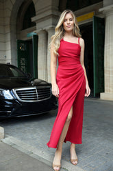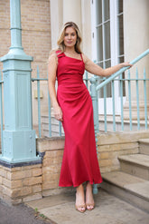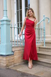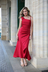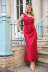 Stunning asymmetrical dress in stretch Scuba Jersey finished with a draped bow detail over one shoulder. A timeless and special dress you will want to wear again and again. Designed to fall to the ankle, waist to hem is approx 38".