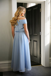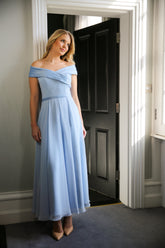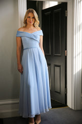 Niki 'Off the Shoulder' Floaty Chiffon Dress in Cashmere Blue
