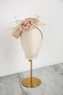 A perfect floral fascinator with sinamay, feathers and two large silk flowers handmade with satin and chiffon petals. Easily adjustable comfort band keeps your fascinator in place. A Stunning fascinator suitable for weddings, race meetings and every special event.