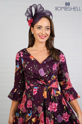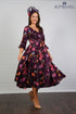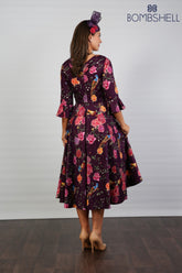 This rich floral fantasy dress falls across your curves beautifully and makes for a stunning silhouette. The 3/4 ruffle cuff sleeve is delightful to wear.