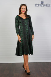 This elegant below the knee length dress has a beautiful wide neckline and long fitted sleeves for the ultimate Bombshell sleek look.