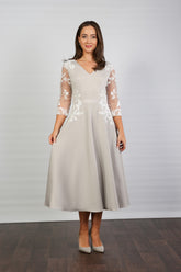 A beautiful midi length occasion wear dress with flattering tulle sleeves. The dress is made from stretch Scuba Jersey and finished with fine floral appliques scattered over the sleeves, shoulders and waist.