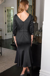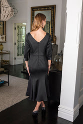Luxurious Scuba Jersey dress with on-trend fit and flare shaping. Classical styling with a feature satin bow at the centre front, boat shaped front neck and back detail with satin covered button decoration. Look and feel fabulous from daytime to evening.